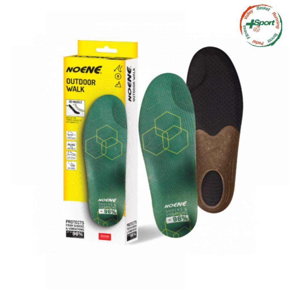 SOLETTE ANTISHOCK E ANTIVIBRAZIONI PER MIGLIORARE LE PRESTAZIONI Ideali per attività all'aria aperta e lunghe camminate Le solette OUTDOOR WALK dispongono di un rinforzo ergonomico in Eva Cork che guida e stabilizza il tallone e la volta plantare nello svolgimento del passo. Uno strato di EVA ABSORB22 centrale, smorza l’impatto di ogni atterraggio e distribuisce il carico dal tallone all’avampiede con un piacevole effetto “soft”. Nella parte anteriore della soletta e’ stato disegnato un incavo per l’alluce che assicura maggior spazio e una spinta piu’ efficace ad ogni passo. PROTEGGONO con uno strato di 2 mm di NOENE® a tutta lunghezza e un inserto specifico per il tallone. Sono rivestite in tessuto traspirante e resistente. Sostituiscono la soletta originale (3D INSOLE).